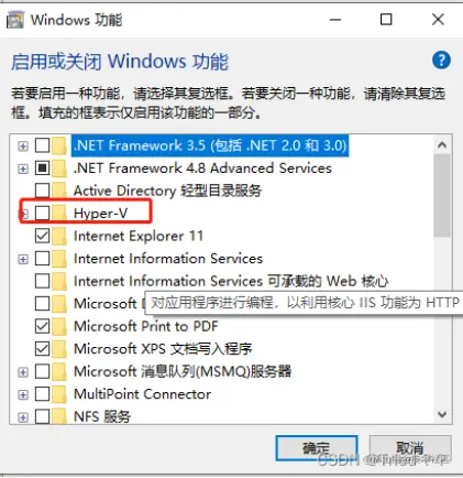 - 然后弹出来的 “Windows 功能” 窗口中找到 “Hyper-V”,我们把 “Hyper-V GUI 管理工具” 和 “Hyper-V 平台” 勾选上,然后点击 “确定” 按键,此时将会安装 Hyper-V 功能相关的组件。
