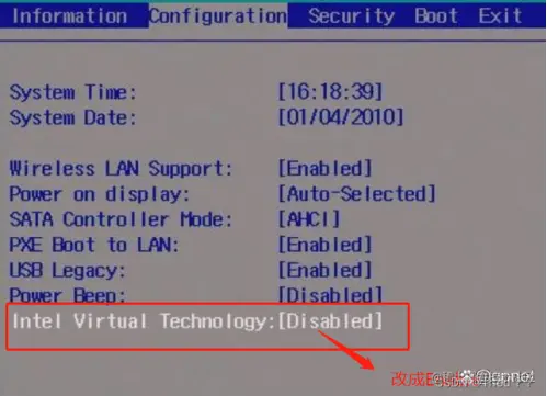 - 进入到 BIOS 管理界面后,我们在管理界面中找到 “Advanced”–>“CPU Configuration” 菜单,点击进去后,如果是 Intel CPU 则找到 “Intel Virtual Technology”,然后设置为 “Enable” 状态;如果是 AMD CPU 则找到 “SVM Support”,然后设置为 “Enable” 状态。注:不同电脑的菜单存在不同的名称,开启时也可以到各自电脑品牌官网查看开启路径。