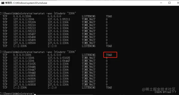 - 端口号被占用了,cmd 输入 netstat -ano |findstr “3306” 搜索一下本地 3306 端口号的使用情况