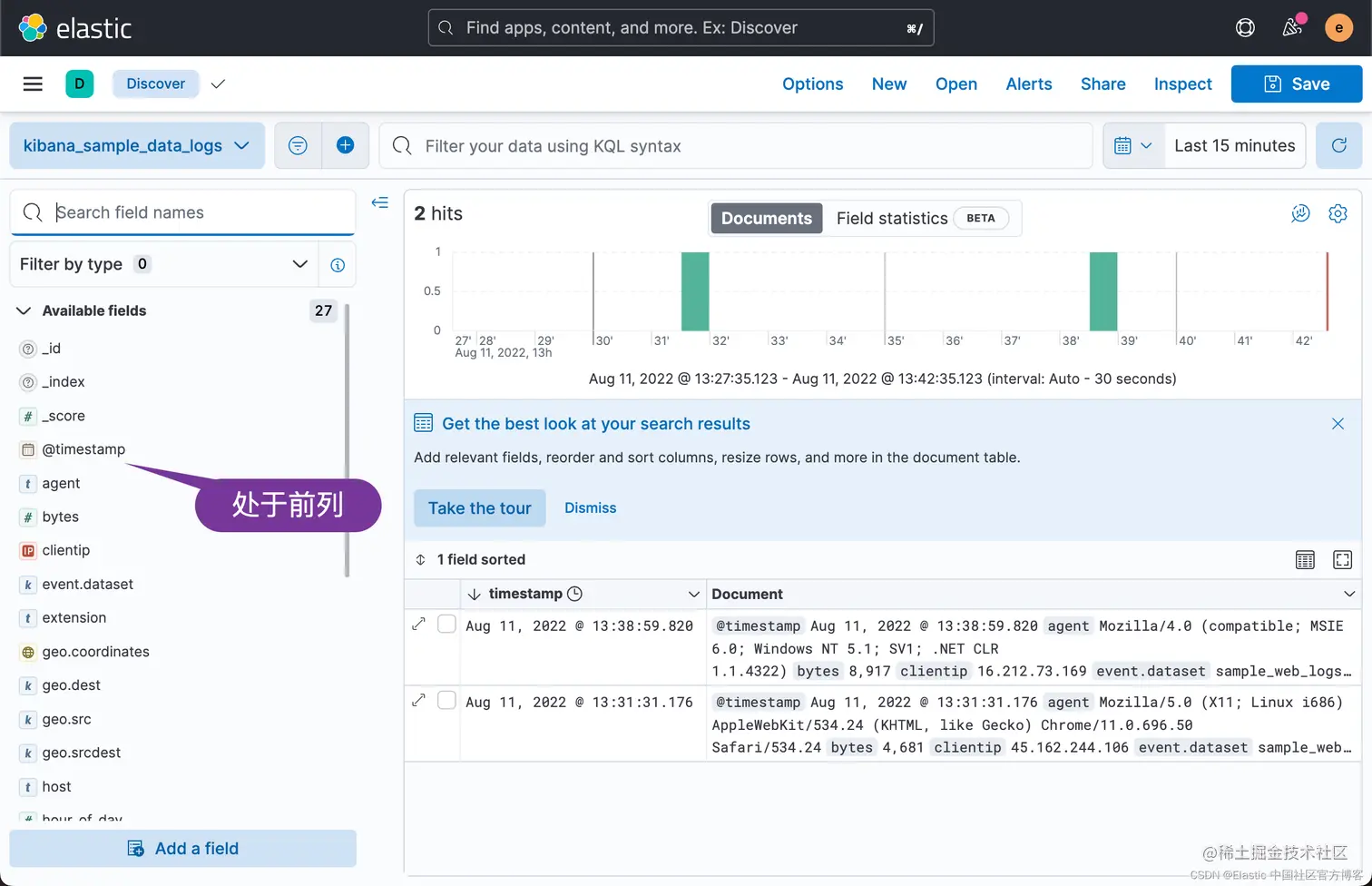 由于添加了 date 过滤器,所以 timestamp 及 @timestamp 现在是一致的了。