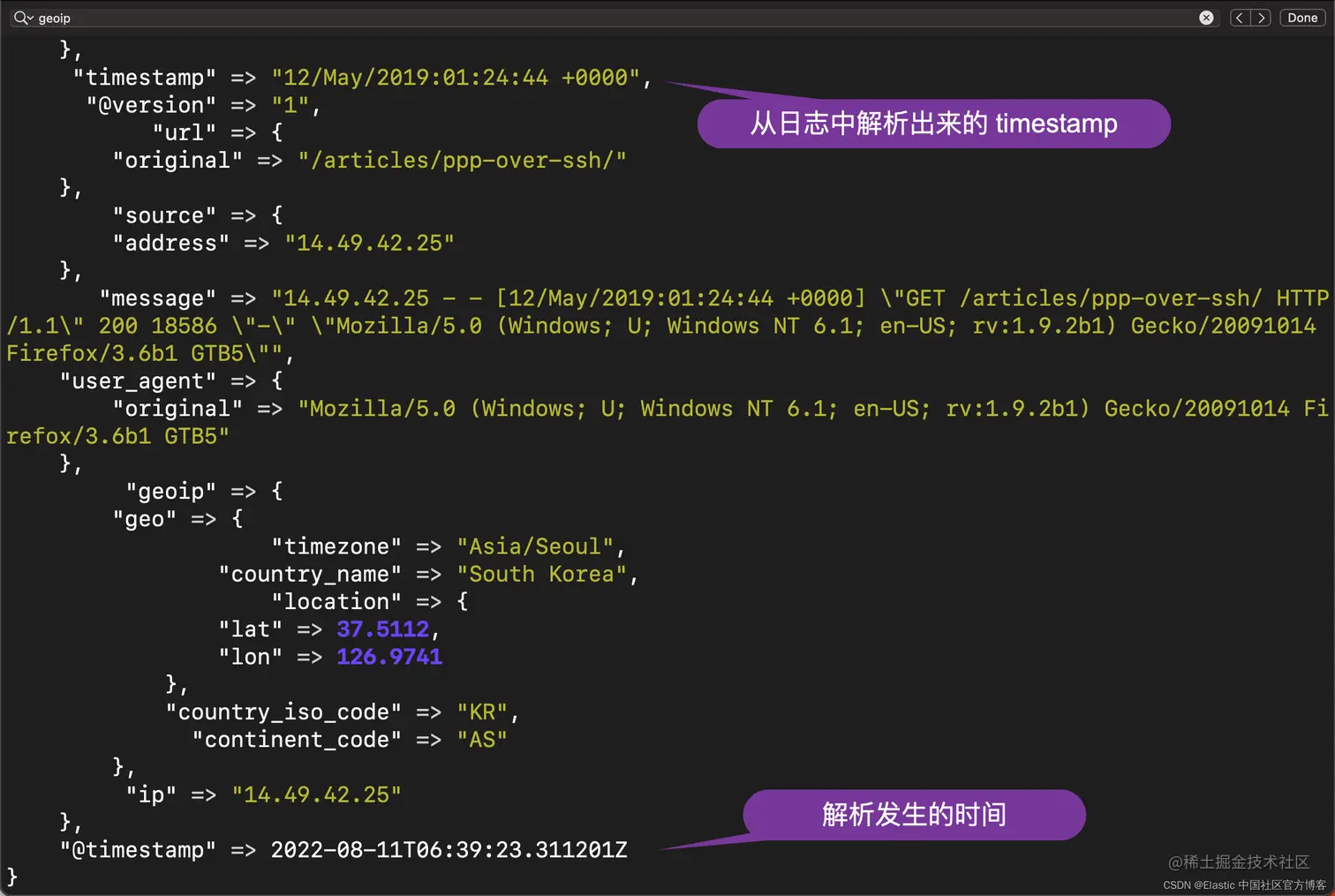 显然在上面有两个时间戳:timestamp 及 @timestamp。它们表达的意思是不一样的。我们希望的是 @timestamp 时间是事件发生的时间,也就是 timestamp 所表达的时间。在这个时候,我们可以使用 date 过滤器来完成: