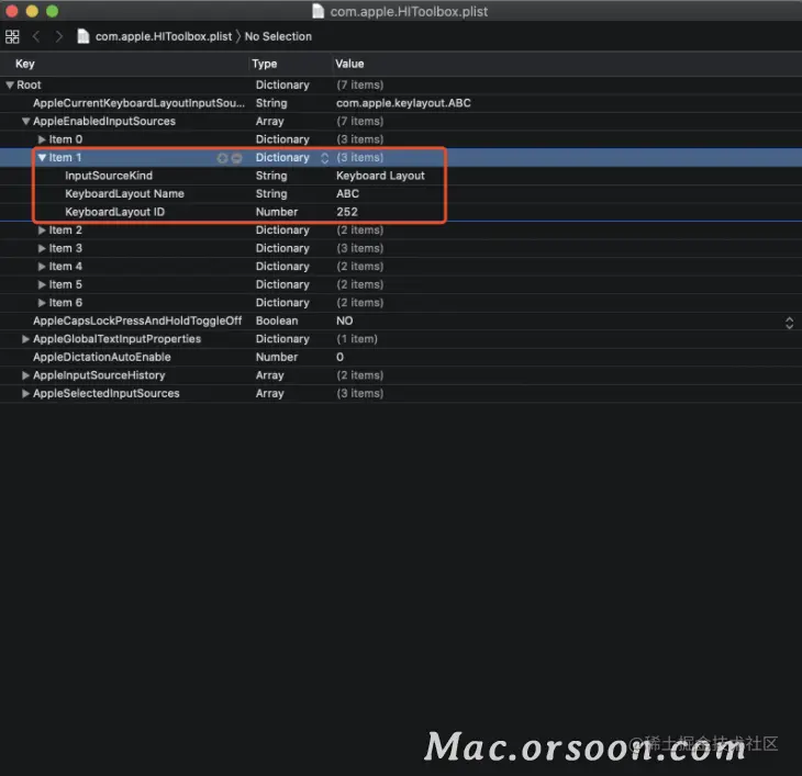 依次点开 Root - AppleEnabledInputSources ,会看到一列 item ,找到其中 KeyboardLayout Name 为 ABC 的那一列,将整列 item 删掉,然后 command + S 保存。