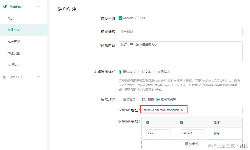 在Mob后台进行推送时,通过scheme://host的格式,例如mlink://com.mob.mobpush.link,如下位置填入: