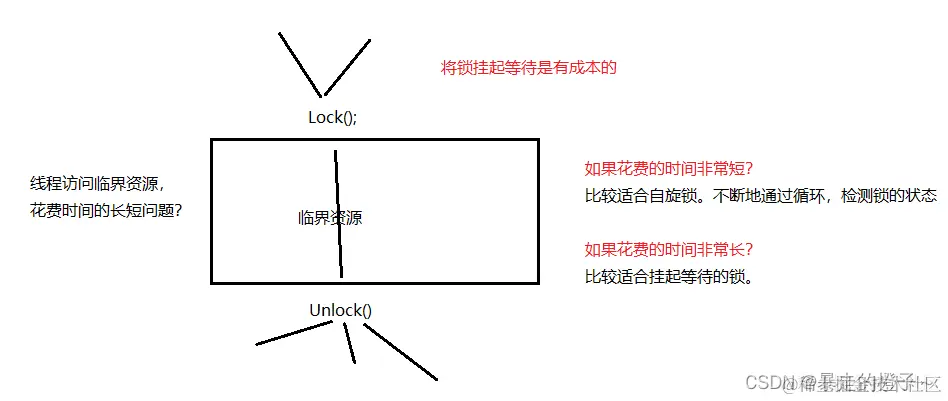 对于临界资源任务处理时间比较短就不适合使用挂起等待的锁,因为可能还没有线程挂起等待,别的线程就释放锁了,这时候线程还得继续挂起然后立刻被唤醒,这是有一定成本的!