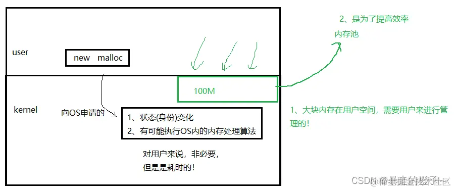 我们如果频繁向OS申请小块空间,OS就要在底层做很多动作,比如进程身份状态的变化,OS执行内存处理算法。这些对于用户层来说都是没必要的,但确实是耗时间的!所以引入了内存池的概念,趁着OS好的时候,一次申请一大块空间,这块空间在用户层进行管理,这样当我们再次申请空间时,就不需要向OS去要了,直接在用户层拿就好了,这样效率大大提高。