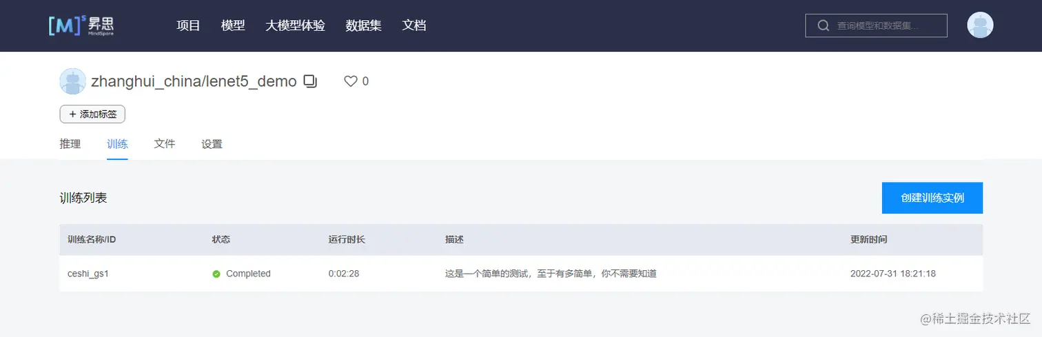 点击“训练”-》“训练作业”,查看训练列表,可以看到训练中的作业: