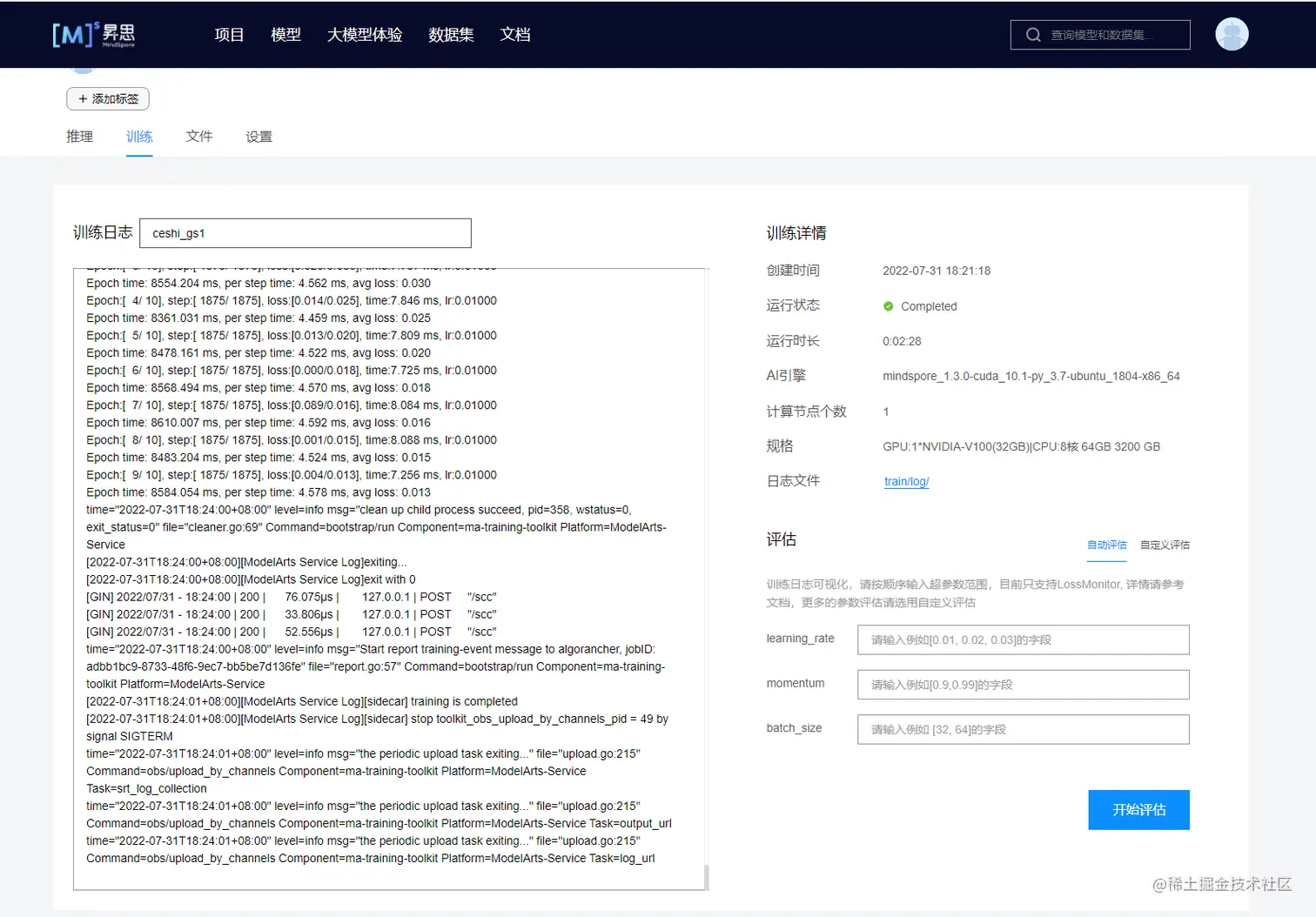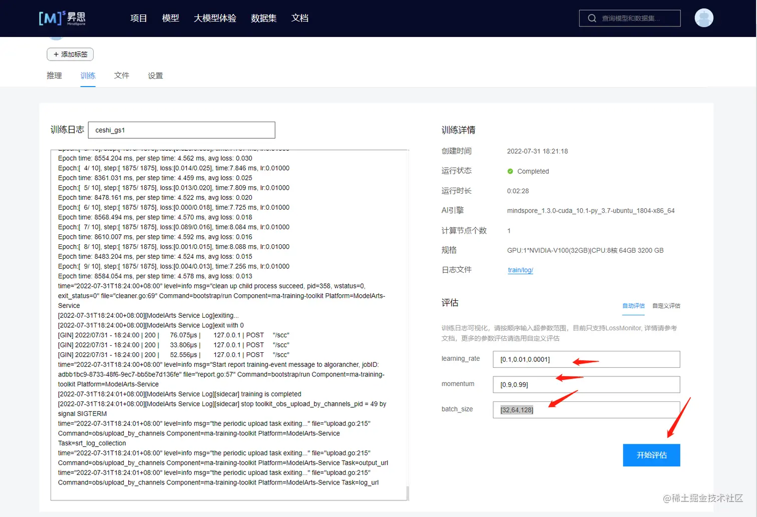 训练结束后,右下角的“开始评估”会变蓝,可以点击。