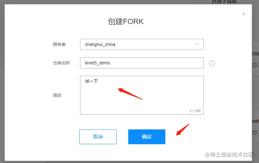 输入“描述”,点击确定,会进入自己fork后的项目: