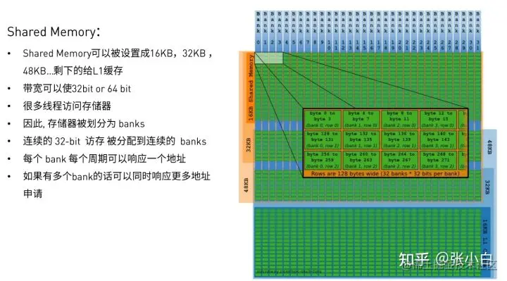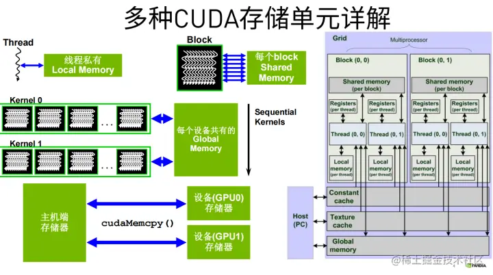 | Shared memory | GPU芯片上 | 实现Block内的线程通信,目前最快的多Thread沟通的地方 | __shared__修饰符 需要__syncThreads()同步 | 分为32个banks 需要省着用,会影响活动warp数量 | 可被1个block所有thread访问,次快 高带宽,低延迟 |