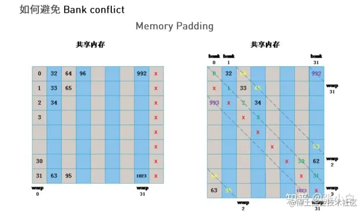通过增加一个空列,让bank强行错位,使得每段连续的数据被分配到不同的bank中。