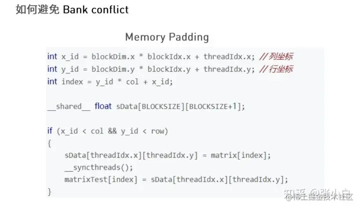就是在设置Shared Memory的时候,不设置成 方阵BLOCK_SIZE X BLOCK_SIZE,而设置成 BLOCK_SIZE X (BLOCK_SIZE+1).