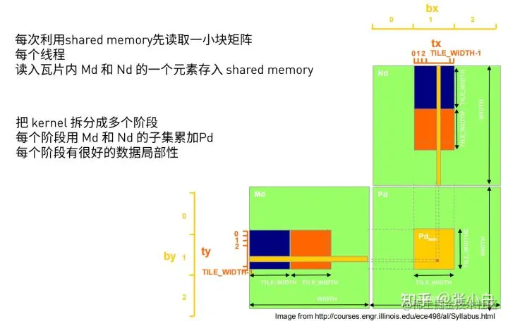 申请两块 Shared Memory,都是BLOCK_SIZE X BLOCK_SIZE 大小。一个沿着矩阵mXn滑动,一个沿着矩阵 nXk滑动。将 子集的结果累加到 目的矩阵中: