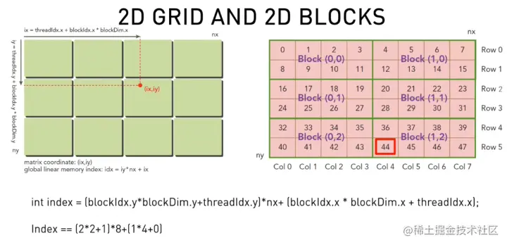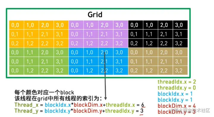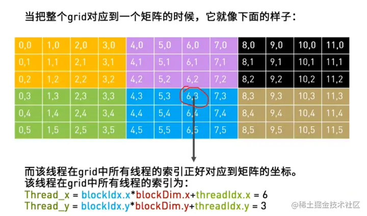 那么,如何使用CUDA将坐标拆开呢?将二维坐标(矩阵)改为 在全局中的索引:需要找到每个线程需要处理元素的位置。