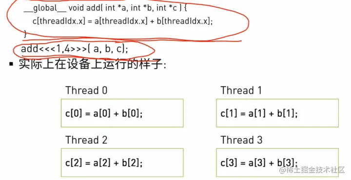 所以对于上面的核函数,相当于有4个thread分别执行了 c[n]=a[n]+b[n]的操作,n=threadIdx.x