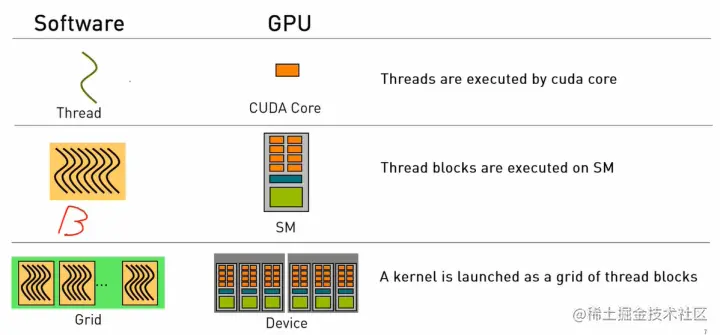 如上图所示,Thread在CUDA core中执行,Block在 SM中执行,Grid在Device中执行。