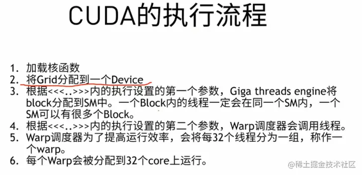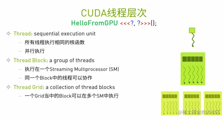 在调用的时候,所有的CUDA核都是执行同一个函数。这与CPU多线程可能会执行不同的任务不同。