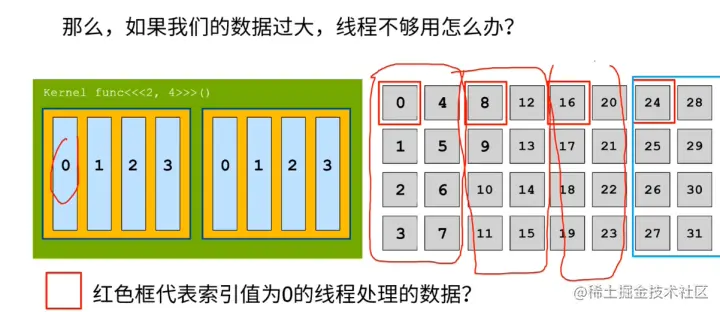 比如对于上图,线程0,需要处理 0,8,16,24 四个数据。核函数需要将每一个大块都跑一遍。代码如下: