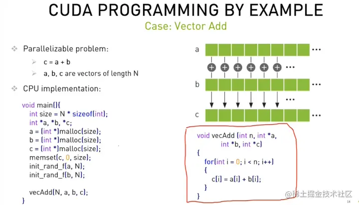先分配 源地址空间a,b,目的地址空间c,并生成a,b的随机数。然后调用 一维矩阵加的CPU函数。