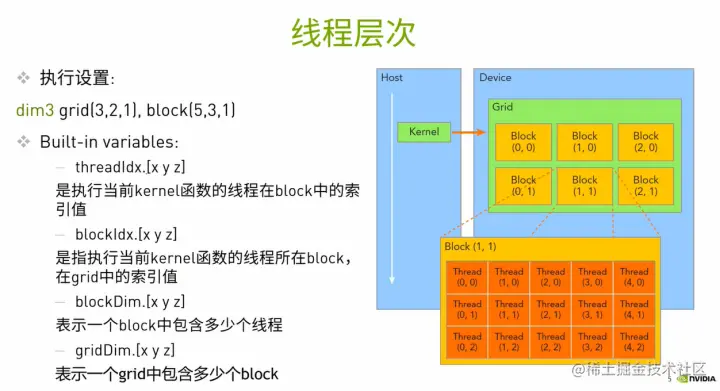 怎么表示thread在block中的相对位置呢?用 threadIdx.x,threadIdx.y,threadIdx.z表示。