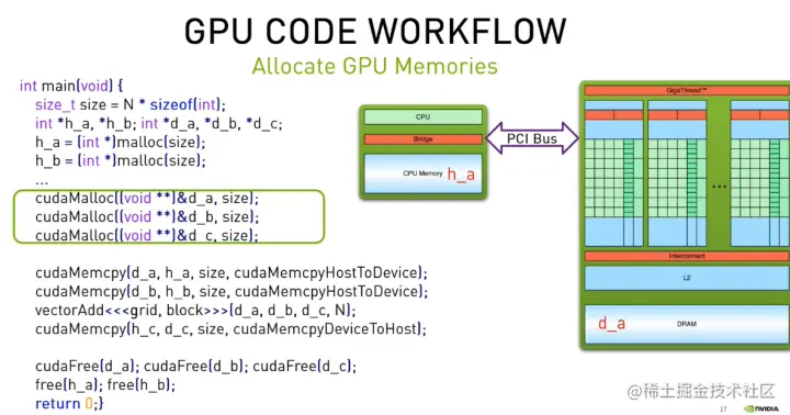 然后申请device内存,这个时候,需要申请 d_a,d_b两个源device内存(cudaMalloc),以及d_c这个目的device内存(cudaMalloc)。将h_a和h_b的内容拷贝到d_a和d_b (显然需要使用 cudaMemcpyHostToDevice);