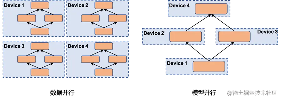 • 与数据并行不同,分布式训练中的模型并行是指将整个神经网络模型拆解分布到不同的 GPU 中,不同的 GPU 负责计算网络模型中的不同部分。这通常是在网络模型很大很大、单个 GPU 的显存已经完全装不下整体网络的情况下才会采用。