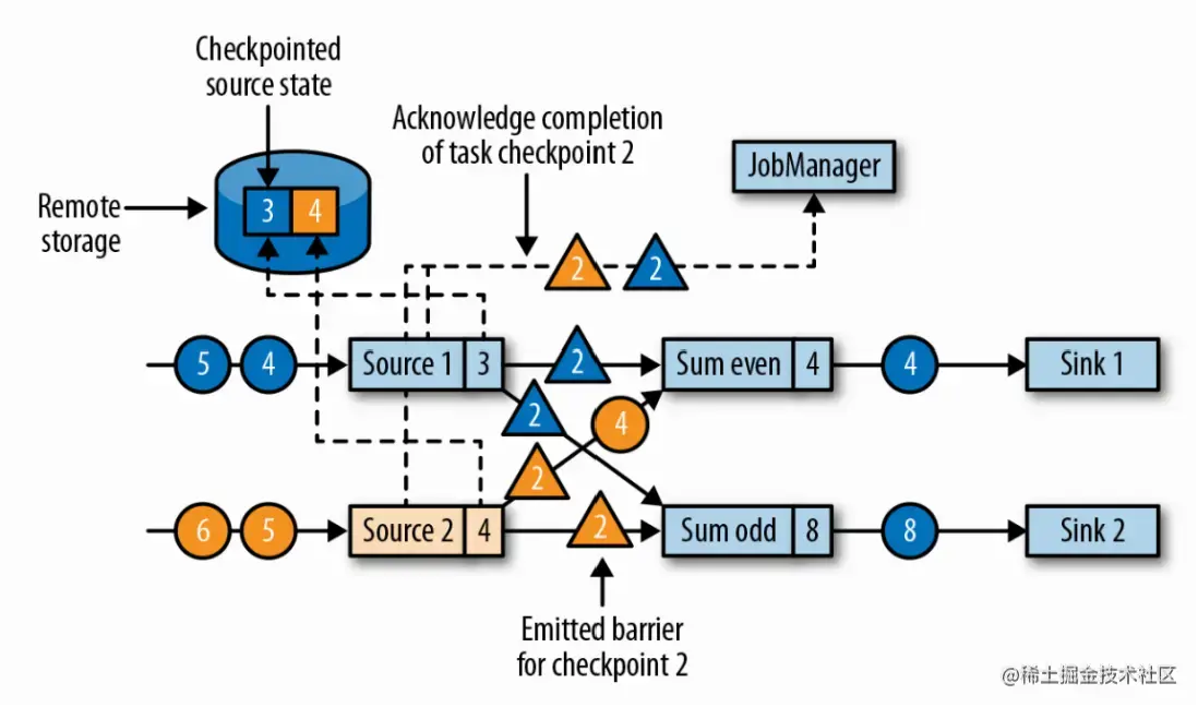 待2处理完后,作业所有算子复制自己的状态并保存到远端可靠存储;