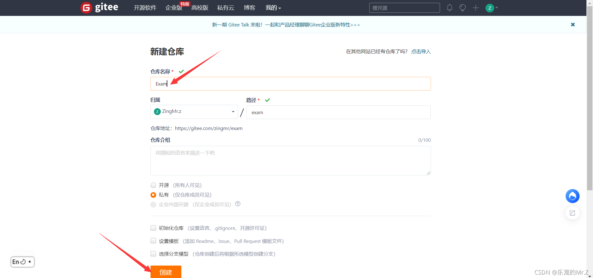 四、gitee账户点击右上角 加号-->新建仓库--->给仓库起一个名字。下面的开源与私有主要看自己需求,最后点击创建。【这时候会自动跳转到仓库页】