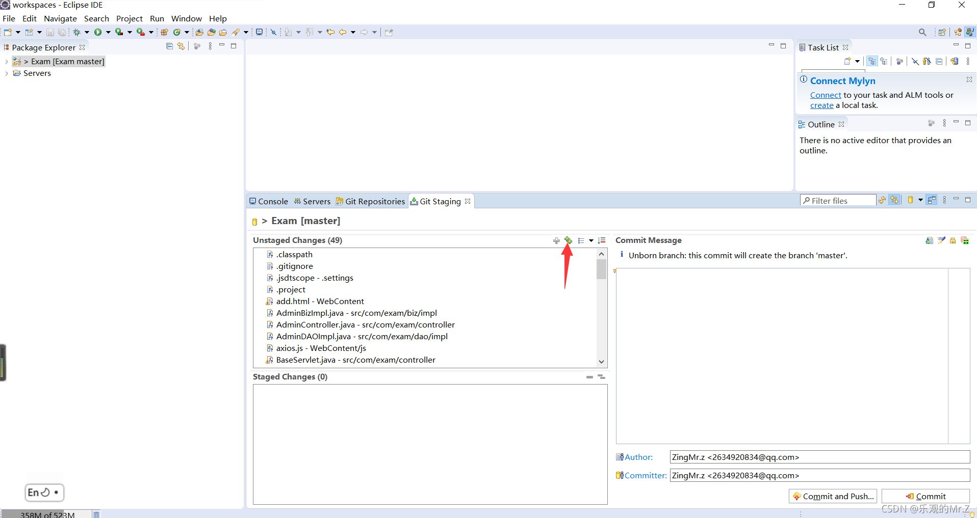 七、选中项目 ==> 右击 ===> team ===> commit ===>点击Git Staging工作台里边Unstaged changes 右侧的绿色"双加号",你所要上传的项目资源就会进入到Staged Changes栏。