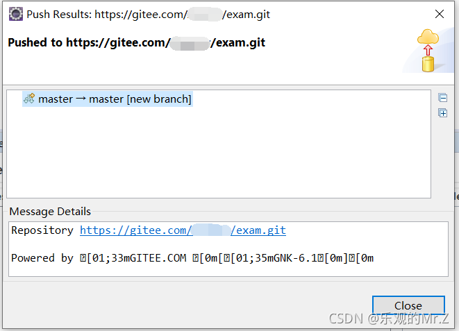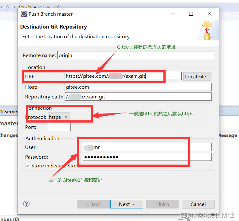 十、点击Commit and Push弹出Destination Git Repository框 ==> 在自己新建的仓库页最上面复制Https格式的仓库地址==>粘贴到eclipse弹框中的URL栏,大部分信息会自动补全 ==>将gitee账户名和密码分别输入弹框中的User与Password栏 ==>next==>next ==>finsh ==>最后弹出让你close的页面,期间没有报错,你项目就上传成功了。