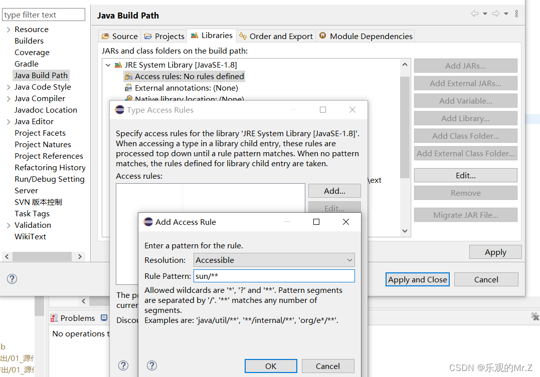 找到当前项目报错文件的当前服务分支,下面的JRE核心库“ JRE System Library ”, 选中右击 ==> Bulid Path ==> Configure Bulid Path ==> 选中Access rules :NO rules defined ==> Edit ==> Add ==> Resolution选择Accessible ==> Rule Pattern :sun/** ==> OK ==> OK ==> Apply and Close