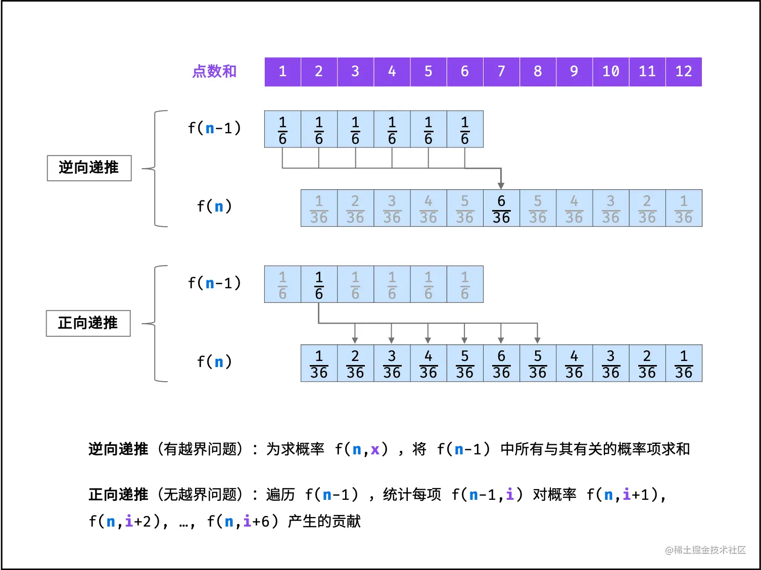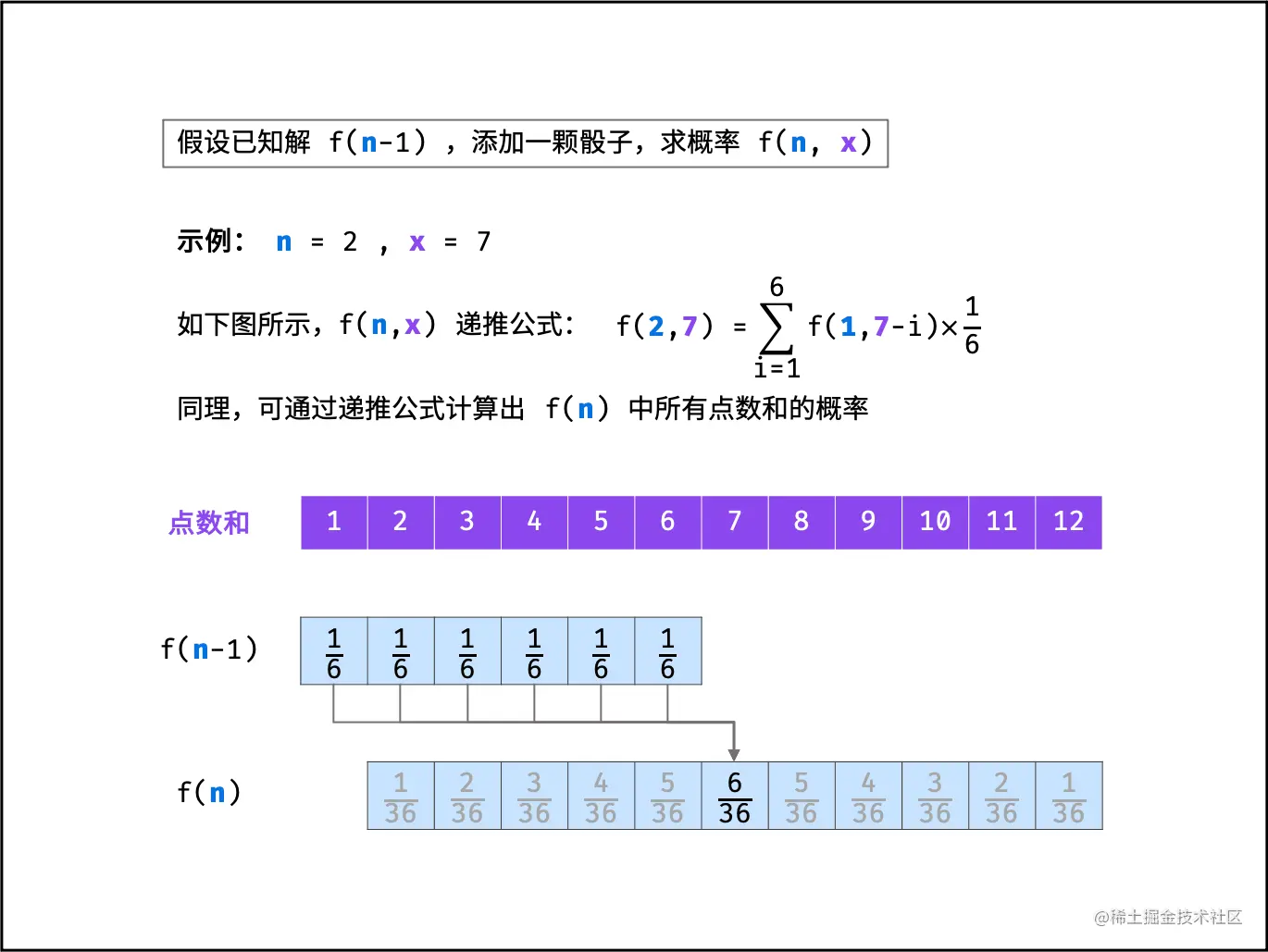 具体来看,由于新增骰子的点数只可能为1至6,因此概率f(n-1,x)仅与f(n,x+ 1), f(n,x + 2), ... f(n,x +6)相关。而,遍历f(n- 1)中各点数和的概率,并将其相加至f(n)中所有相关项,即可完成f(n- 1)至f(n)的递推。