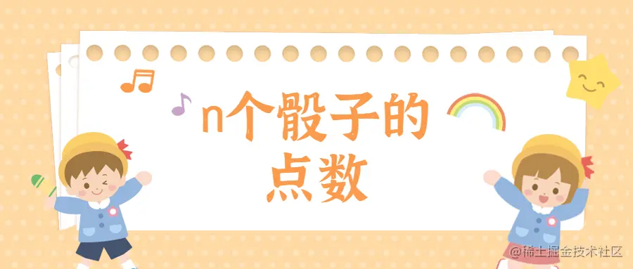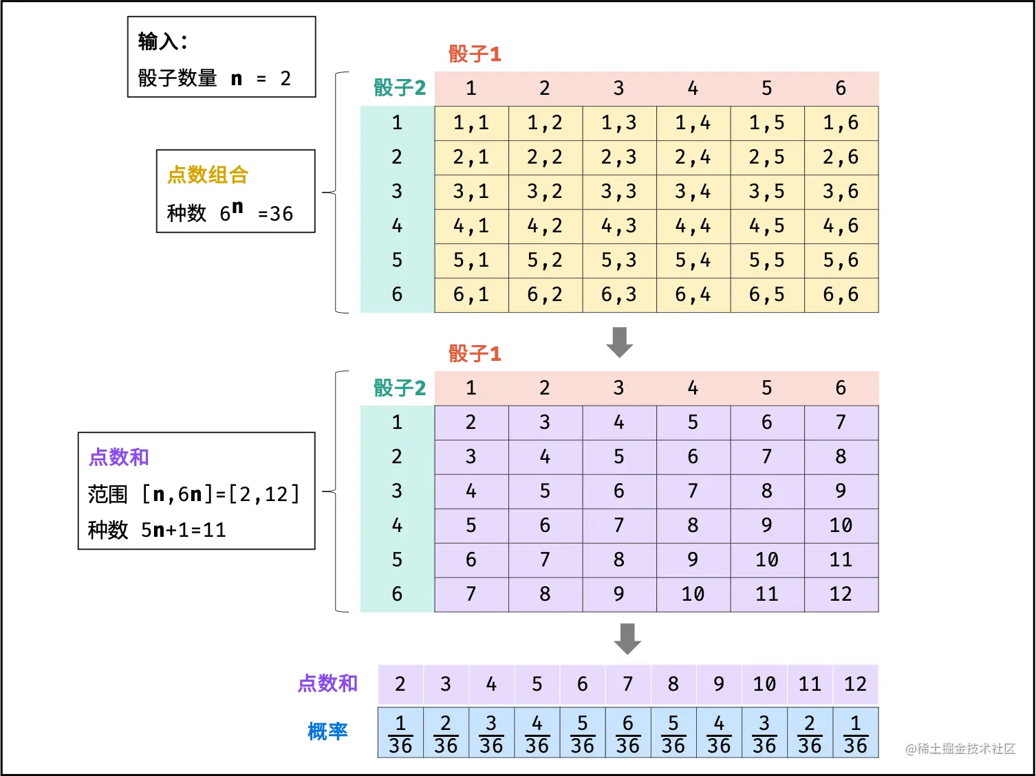 - 将每个骰子的点数看作独立情况,共有6n种「 点数组合」。例如n = 2时的点数组合为: (1,1),(1,2)... ,(2, 1),(2,2),,.. ,(6,1),... ,(6,6)