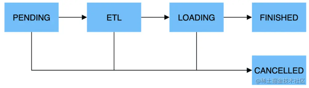在异步的导入方式 Broker Load 和 Spark Load 中,一个导入作业的执行流程主要分为 5 个阶段,如下图所示:
