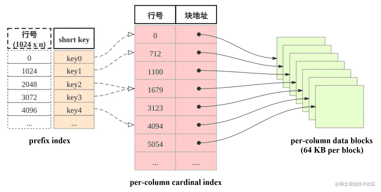 - Per-column cardinal index:表中每列数据都有各自的行号索引表。 列的数据块和行号索引一一对应,索引由数据块的起始行号及数据块的位置和长度信息构成。用数据行的行号查找行号索引表,可以获取包含该行号的数据块所在的位置,读取目标数据块后,可以进一步查找数据。