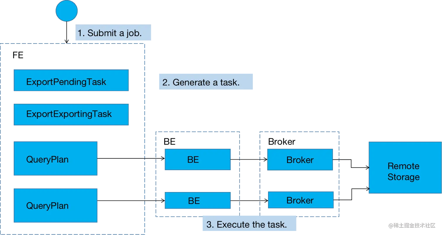 EXPORTING阶段:FE 生成一个 ExportExportingTask,BE和Broker会根据FE生成的查询计划配合完成数据导出工作。
