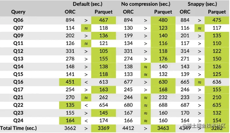 - 压缩与查询性能:在压缩空间与查询性能方面,Parquet 与 ORC 总体上相差不大。可能 ORC 要稍好于 Parquet。