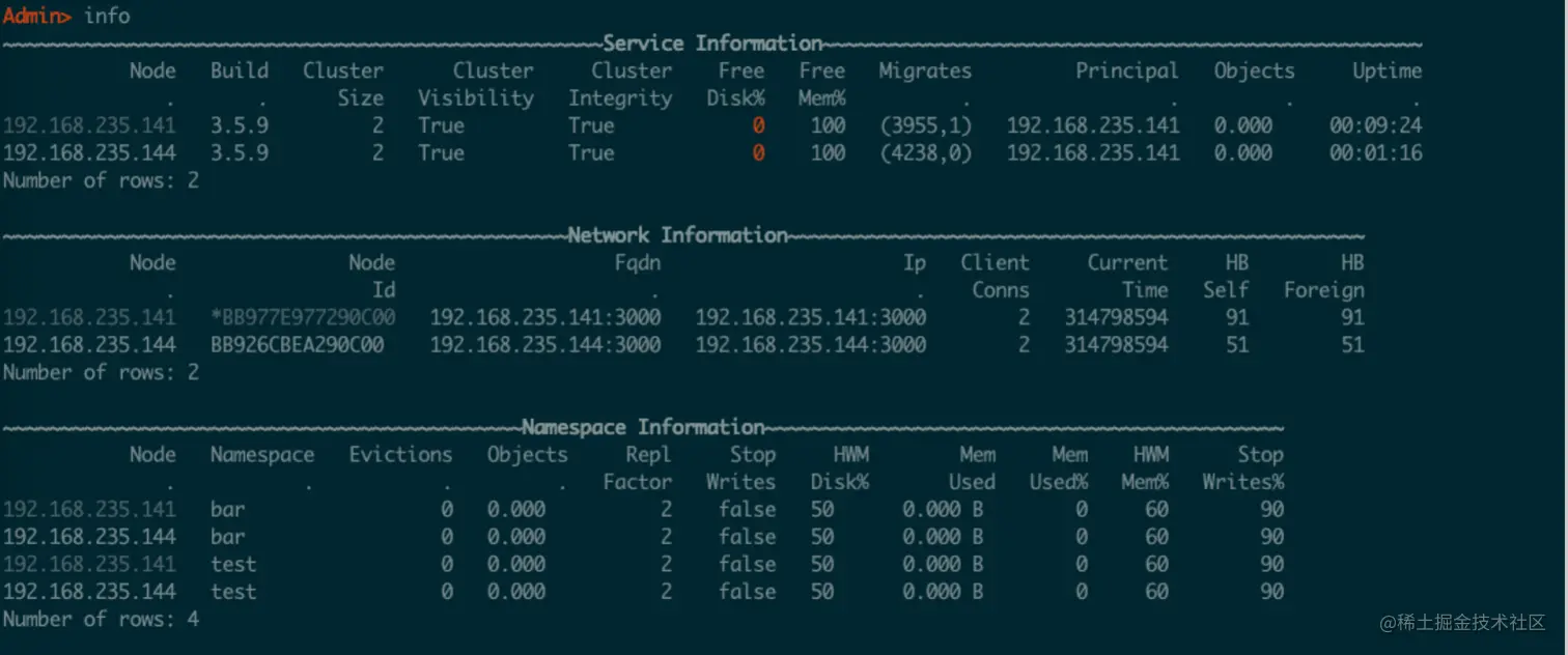 假设现在有一个3个Aerospike节点组成的集群,各节点的IP依次为192.168.235.131、192.168.235.132、192.168.235.133,端口号都是3000。存放数据的namespace为alvin、set为frms。