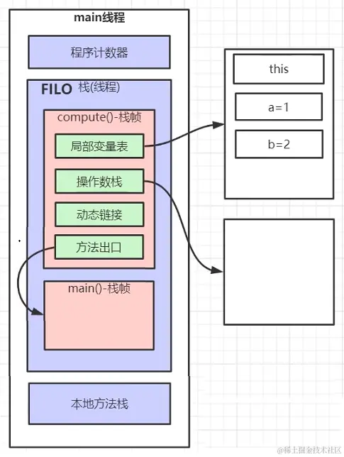 2.接着调用了 compute() 方法, 创建了 compute 方法的栈帧, 并压入 main 线程栈.