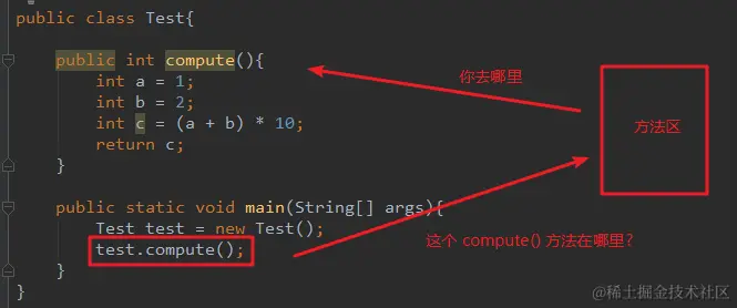 ② 操作数栈, 是一个用于计算的临时的数据中转区域. 一个变量不能直接放入局部变量表中, 而是先入操作数栈, 再从操作数栈出栈到局部变量表. 比如上面代码中, compute 方法中 int a = 1 这句代码, JVM 会先将数字 1 压入 操作数栈, 然后在局部变量表中创建局部变量 a, 然后从操作数栈中将数字 1 弹出来, 赋值给变量 a.