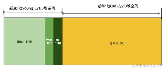 默认情况下, 新生代 ( Young ) 与老年代 ( Old ) 的比例的值为 1:2 , Eden : from : to = 8 : 1 : 1