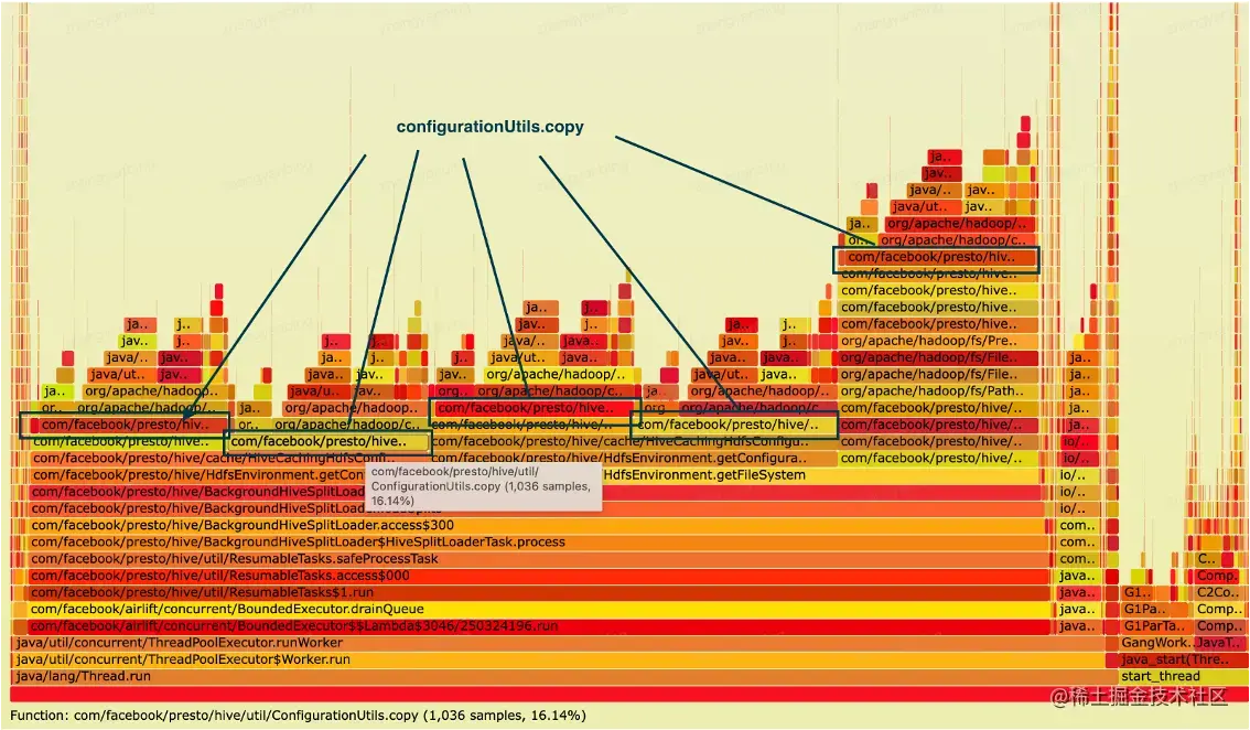 火焰图用于分析热点代码占用大量cpu,从而导致服务性能下降的情况。如下图,自底向上为调用关系。上层宽度越宽表示当前函数cpu耗时越久,我们关注最宽的函数调用。