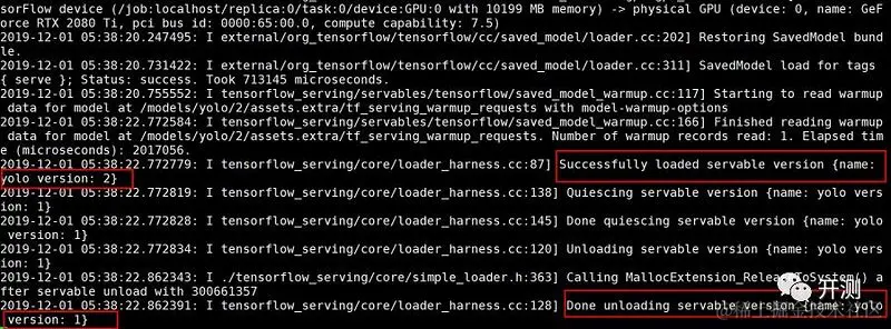 tf serving可以维护模型的多个版本,当在模型目录下放入新版本模型,tf serving监听到有新版本模型加入后,会将新版本模型加载进内存中同时卸载之前加载的旧模型,日志输出示意图如下图所示: