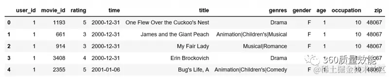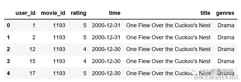 Pandas提供merge函数合并数据集,类似于sql中的join操作,分为可设为inner(默认内连接),outer(外连接),left(左连接),right(右连接)。将data_movies与data_ratings合并成data数据集。
