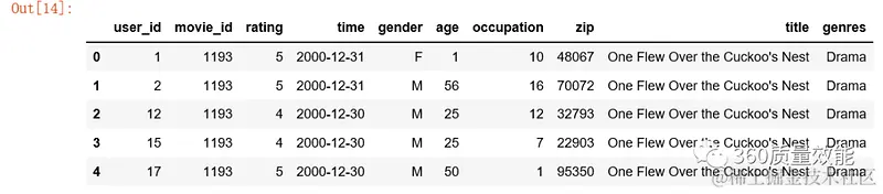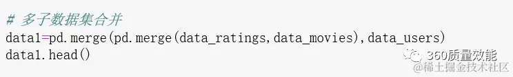 上面是将两个子数据集合并,也可以多个子数据集合并,将data_movies,data_ratings与data_users一起合并成data1,可以使用两层merge函数合并数据集,也可以使用merge函数将data与data_users合并。