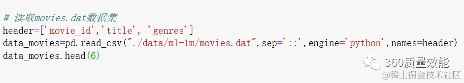 ② 读取movies.dat数据集并输出前6条数据,此处自定义数据展示的条数。