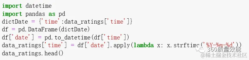 首先使用Pandas中的to_datetime函数将date列从object格式转化为datetime格式,然后通过strftime(’%Y%m%d’)取出年月日,把这个函数用apply lambda应用到data_ratings[‘timestamp’]的这一列中。