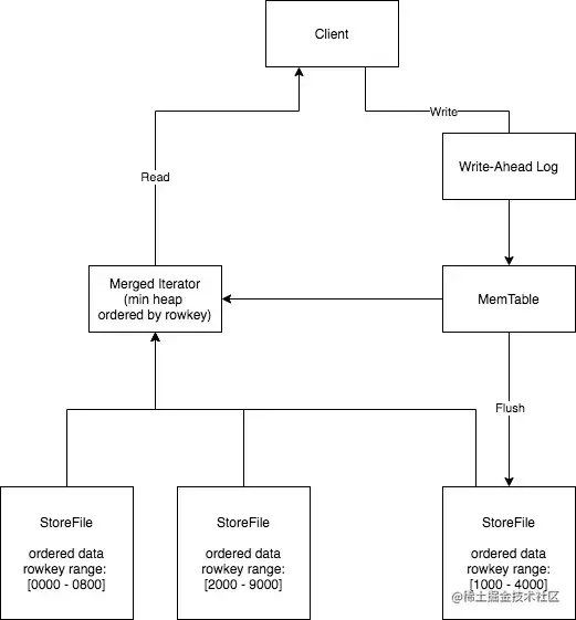 每个HFile内的数据按rowkey有序存储,但HFile间没有顺序保证。这一特点是由于LSM的写入方式决定的,下面介绍LSM树的读写流程: