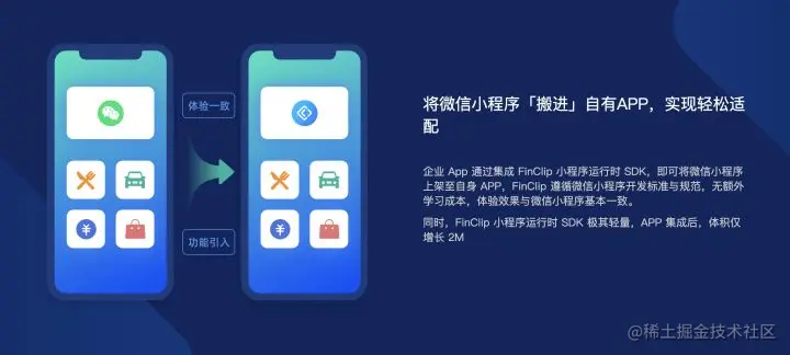 首先,FinClip天然支持微信小程序语法 WXML,无需使用第三方跨端跨框架解决方案,即可编译运行已有微信小程序代码,无额外学习成本,体验效果与微信小程序基本一致。