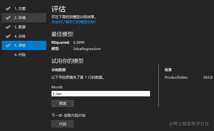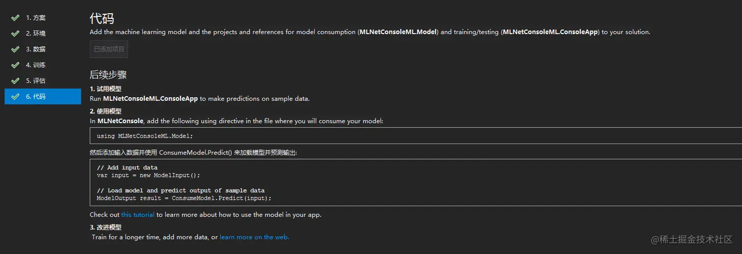 然后点击代码,将ML.Net代码添加到解决方案中,如下图: