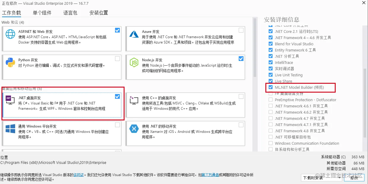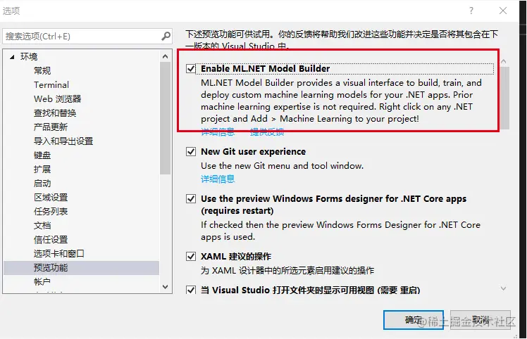 点击机器学习时,如果我们没有开启MLNET模型创建功能,则会弹出提示,让我们开启。